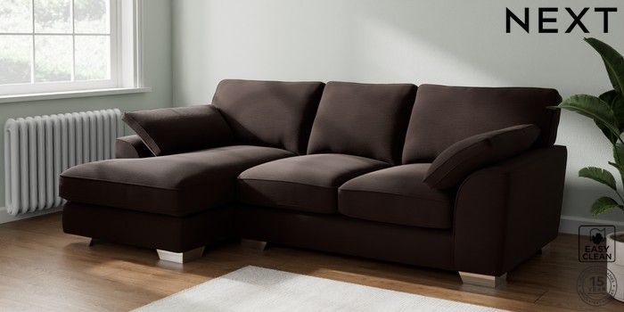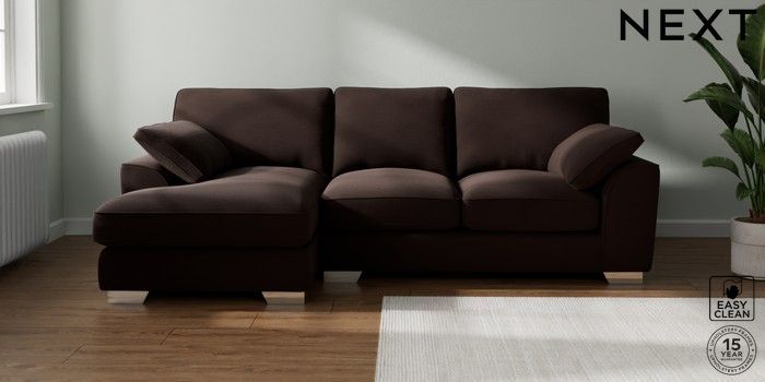 7.3.1 Buy Stamford Grand Relaxed Sit Medium Sofa Chaise - Left Hand Fine Chenille Easy Clean Chocolate Brown Large Square Angle - Chrome Metal from the Next UK online shop Click here to use our accessible website