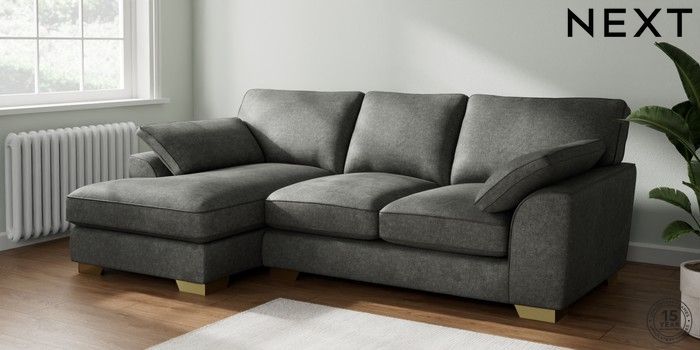 7.2.10 Buy Stamford Grand Relaxed Sit Medium Sofa Chaise - Left Hand Plush Chenille Dark Grey Large Square Angle - Brushed Brass from the Next UK online shop Click here to use our accessible website