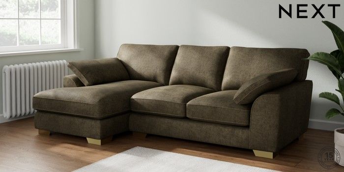7.2.10 Buy Stamford Grand Relaxed Sit Medium Sofa Chaise - Left Hand Plush Chenille Moss Green Large Square Angle - Brushed Brass from the Next UK online shop Click here to use our accessible website