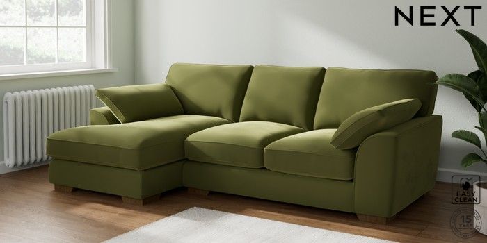 7.3.1 Buy Stamford Grand Relaxed Sit Medium Sofa Chaise - Left Hand Plush Velvet Easy Clean Mid Olive Green Large Square Angle - Mid from the Next UK online shop Click here to use our accessible website