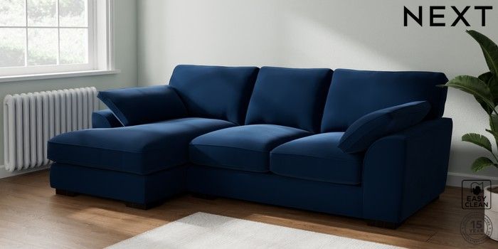 7.3.1 Buy Stamford Grand Relaxed Sit Medium Sofa Chaise - Left Hand Plush Velvet Easy Clean Navy Blue Large Square Angle - Dark from the Next UK online shop Click here to use our accessible website