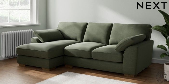 7.3.1 Buy Stamford Grand Relaxed Sit Medium Sofa Chaise - Left Hand Relaxed Linen Look Dark Green Large Square Angle - Mid from the Next UK online shop Click here to use our accessible website