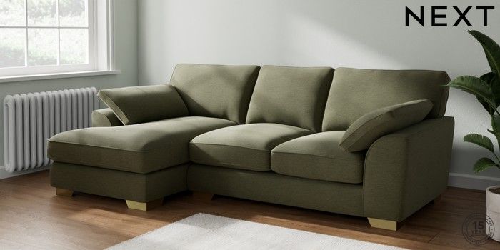 7.2.10 Buy Stamford Grand Relaxed Sit Medium Sofa Chaise - Left Hand Ripple Chenille Mid Moss Green Large Square Angle - Brushed Brass from the Next UK online shop Click here to use our accessible website