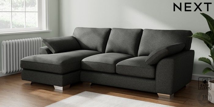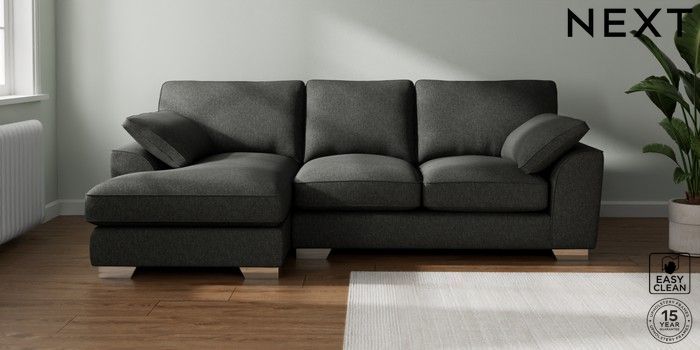 7.3.1 Buy Stamford Grand Relaxed Sit Medium Sofa Chaise - Left Hand Tweedy Blend Easy Clean Charcoal Grey Large Square Angle - Chrome Metal from the Next UK online shop Click here to use our accessible website