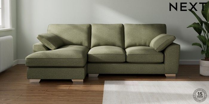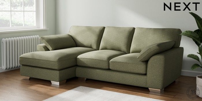 7.3.1 Buy Stamford Grand Relaxed Sit Medium Sofa Chaise - Left Hand Tweedy Chenille Mid Moss Green Large Square Angle - Chrome Metal from the Next UK online shop Click here to use our accessible website