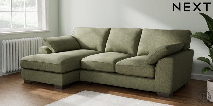 7.3.1 Buy Stamford Grand Relaxed Sit Medium Sofa Chaise - Left Hand Tweedy Chenille Mid Moss Green Large Square Angle - Gunmetal from the Next UK online shop Click here to use our accessible website