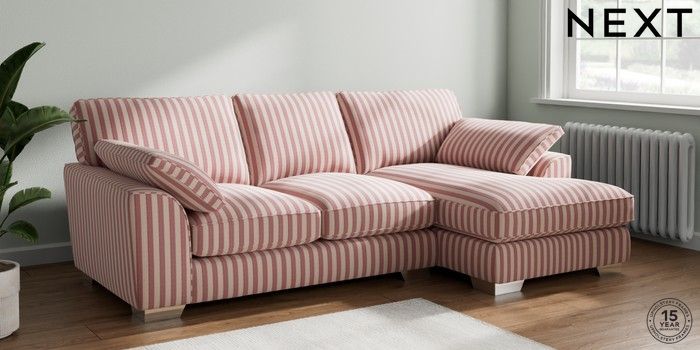 7.2.10 Buy Stamford Grand Relaxed Sit Medium Sofa Chaise - Right Hand Bold Chenille Stripe Dark Pink Large Square Angle - Chrome Metal from the Next UK online shop Click here to use our accessible website