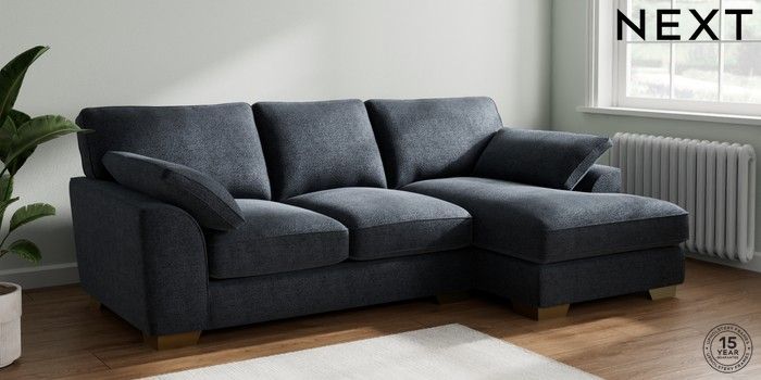 7.3.1 Buy Stamford Grand Relaxed Sit Medium Sofa Chaise - Right Hand Boucle Chenille Dark Slate Blue Large Square Angle - Brushed Brass from the Next UK online shop Click here to use our accessible website