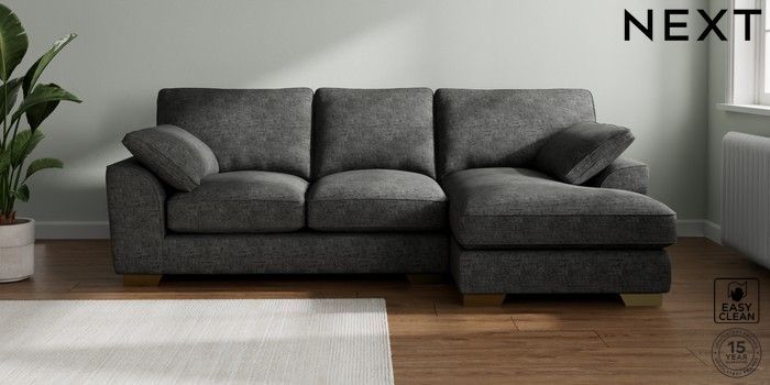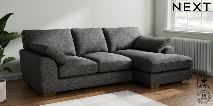 7.3.1 Buy Stamford Grand Relaxed Sit Medium Sofa Chaise - Right Hand Boucle Weave Easy Clean Charcoal Grey Large Square Angle - Brushed Brass from the Next UK online shop Click here to use our accessible website