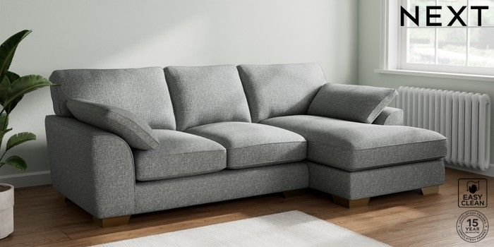 7.2.10 Buy Stamford Grand Relaxed Sit Medium Sofa Chaise - Right Hand Chunky Boucle Easy Clean Mid Grey Large Square Angle - Brushed Brass from the Next UK online shop Click here to use our accessible website