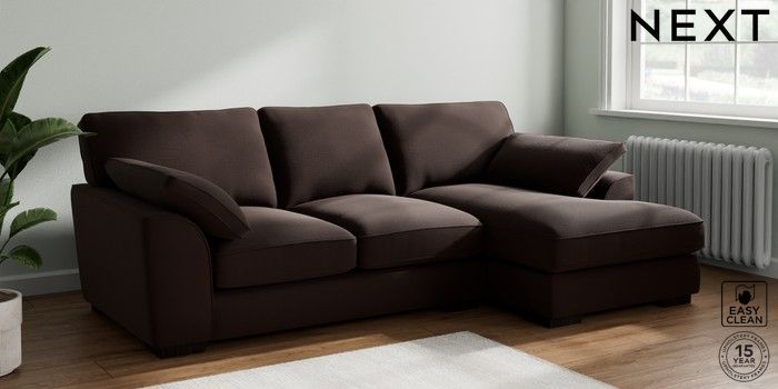 7.2.10 Buy Stamford Grand Relaxed Sit Medium Sofa Chaise - Right Hand Fine Chenille Easy Clean Chocolate Brown Large Square Angle - Dark from the Next UK online shop Click here to use our accessible website