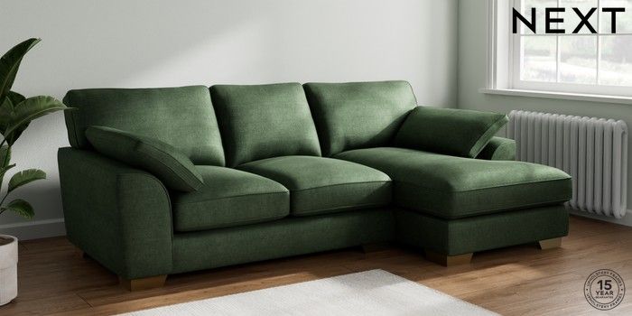 7.2.10 Buy Stamford Grand Relaxed Sit Medium Sofa Chaise - Right Hand Luxe Chenille Dark Green Large Square Angle - Brushed Brass from the Next UK online shop Click here to use our accessible website