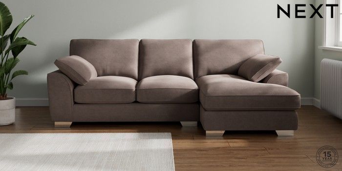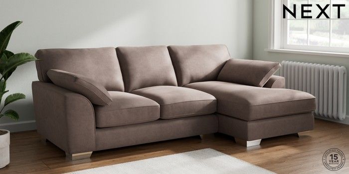 7.3.1 Buy Stamford Grand Relaxed Sit Medium Sofa Chaise - Right Hand Luxe Chenille Mink Brown Large Square Angle - Chrome Metal from the Next UK online shop Click here to use our accessible website