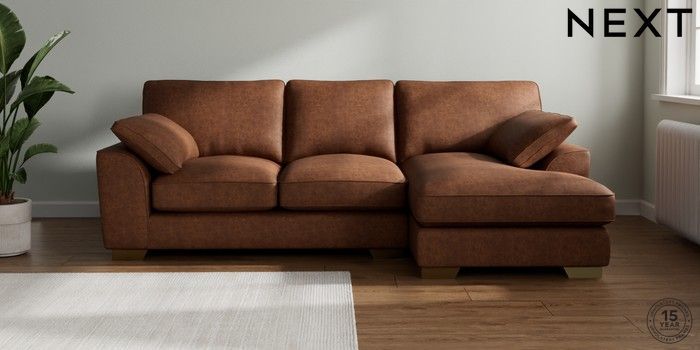 7.3.1 Buy Stamford Grand Relaxed Sit Medium Sofa Chaise - Right Hand Monza Faux Leather Easy Clean Chestnut Brown Large Square Angle - Brushed Brass from the Next UK online shop Click here to use our accessible website