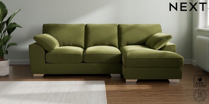 7.3.1 Buy Stamford Grand Relaxed Sit Medium Sofa Chaise - Right Hand Plush Velvet Easy Clean Mid Olive Green Large Square Angle - Chrome Metal from the Next UK online shop Click here to use our accessible website