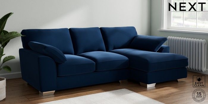 7.3.1 Buy Stamford Grand Relaxed Sit Medium Sofa Chaise - Right Hand Plush Velvet Easy Clean Navy Blue Large Square Angle - Chrome Metal from the Next UK online shop Click here to use our accessible website
