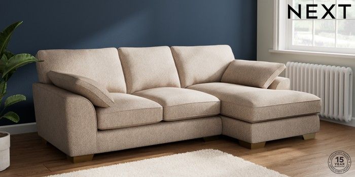 7.3.1 Buy Stamford Grand Relaxed Sit Medium Sofa Chaise - Right Hand Tweedy Chenille Mid Natural Large Square Angle - Brushed Brass from the Next UK online shop Click here to use our accessible website