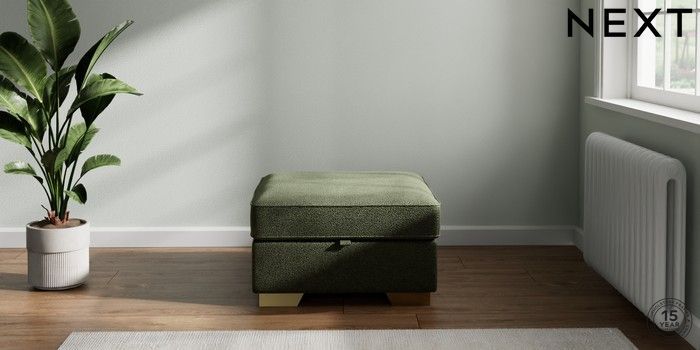 7.3.1 Buy Stamford Grand Relaxed Sit Storage Footstool Boucle Chenille Dark Moss Green Square Angle - Brushed Brass from the Next UK online shop Click here to use our accessible website