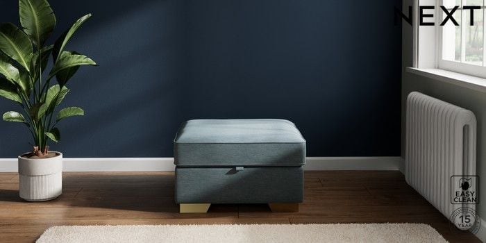 7.2.10 Buy Stamford Grand Relaxed Sit Storage Footstool Fine Chenille Easy Clean Mid Blue Square Angle - Brushed Brass from the Next UK online shop Click here to use our accessible website