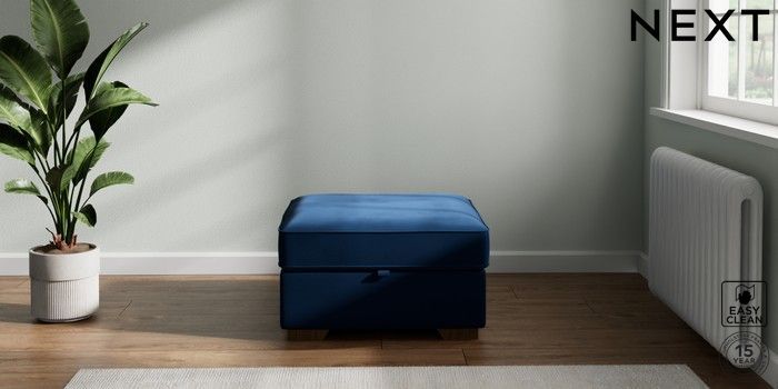 7.3.1 Buy Stamford Grand Relaxed Sit Storage Footstool Plush Velvet Easy Clean Navy Blue Square Angle - Mid from the Next UK online shop Click here to use our accessible website