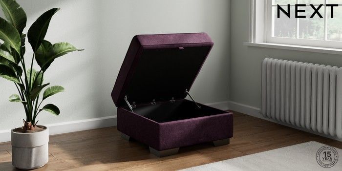 7.3.1 Buy Stamford Grand Relaxed Sit Storage Footstool Plush Chenille Dark Plum Purple Square Angle - Gunmetal from the Next UK online shop Click here to use our accessible website
