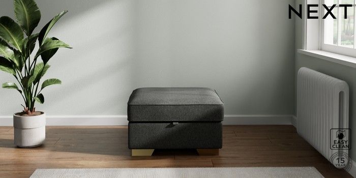 7.3.1 Buy Stamford Grand Relaxed Sit Storage Footstool Tweedy Blend Easy Clean Charcoal Grey Square Angle - Brushed Brass from the Next UK online shop Click here to use our accessible website