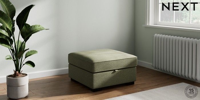 7.3.1 Buy Stamford Grand Relaxed Sit Storage Footstool Tweedy Chenille Mid Moss Green Square Angle - Dark from the Next UK online shop Click here to use our accessible website
