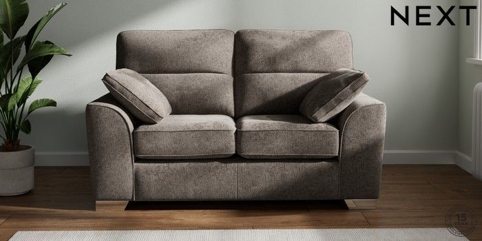 7.3.1 Buy Stamford Highback 2 Seater Small Sofa Chunky Chenille Mink Brown Large Square Angle - Chrome Metal from the Next UK online shop Click here to use our accessible website