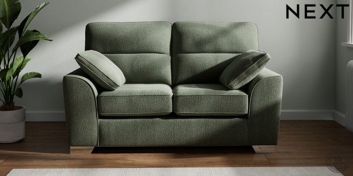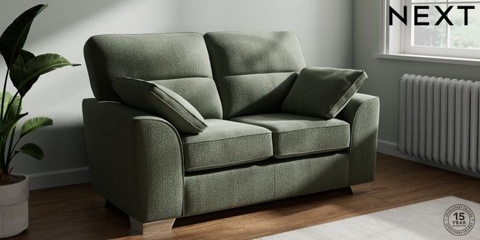 7.2.10 Buy Stamford Highback 2 Seater Small Sofa Chunky Texture Mid Forest Green Large Square Angle - Chrome Metal from the Next UK online shop Click here to use our accessible website