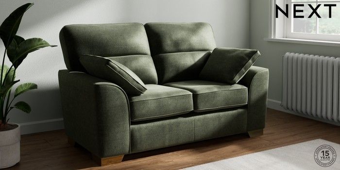 7.2.6 Buy Stamford Highback 2 Seater Small Sofa Luxe Chenille Mid Green Large Square Angle - Brushed Brass from the Next UK online shop Click here to use our accessible website