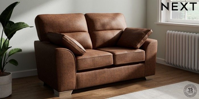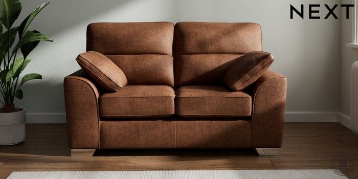 7.3.1 Buy Stamford Highback 2 Seater Small Sofa Monza Faux Leather Easy Clean Chestnut Brown Large Square Angle - Chrome Metal from the Next UK online shop Click here to use our accessible website
