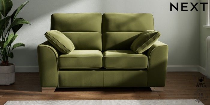 7.2.6 Buy Stamford Highback 2 Seater Small Sofa Plush Velvet Easy Clean Mid Olive Green Large Square Angle - Chrome Metal from the Next UK online shop Click here to use our accessible website
