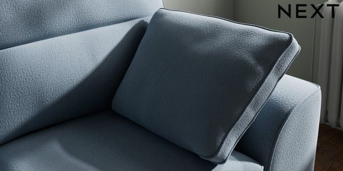 7.3.1 Buy Stamford Highback 2 Seater Small Sofa Relaxed Linen Look Mid Blue Large Square Angle - Chrome Metal from the Next UK online shop Click here to use our accessible website