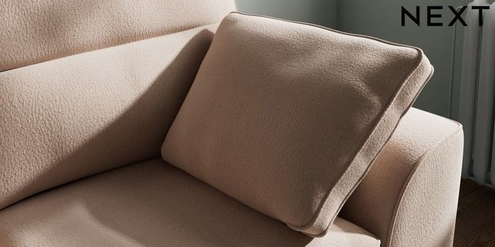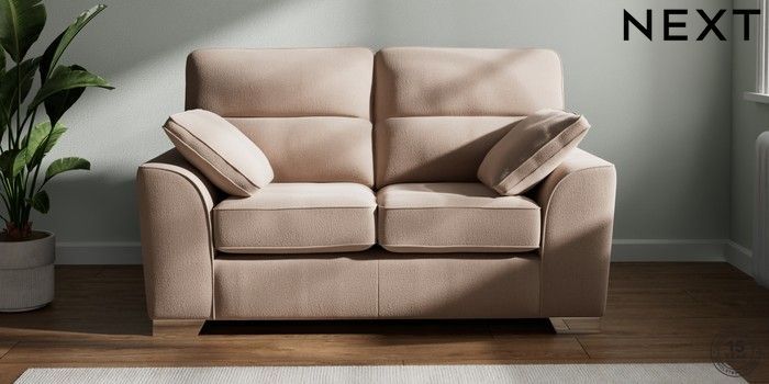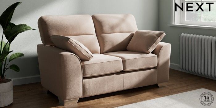 7.3.1 Buy Stamford Highback 2 Seater Small Sofa Relaxed Linen Look Mid Natural Large Square Angle - Chrome Metal from the Next UK online shop Click here to use our accessible website