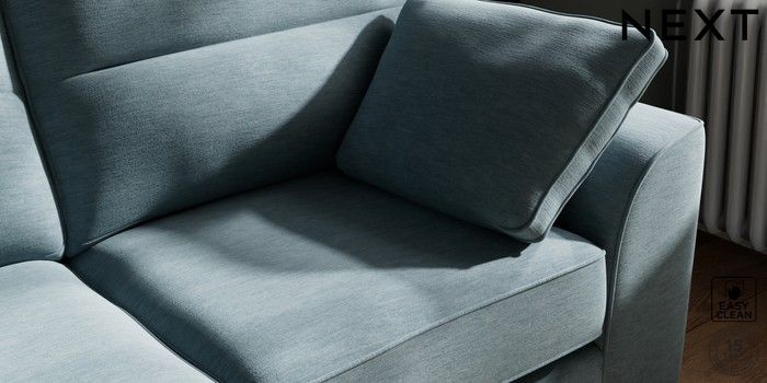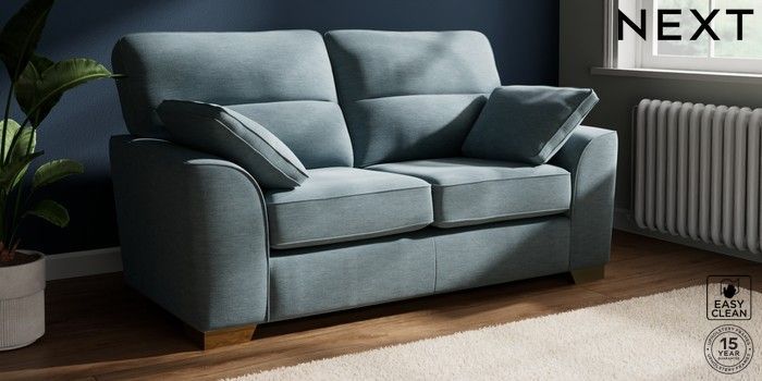 7.2.10 Buy Stamford Highback 2 Seater Sofa Fine Chenille Easy Clean Mid Blue Large Square Angle - Brushed Brass from the Next UK online shop Click here to use our accessible website
