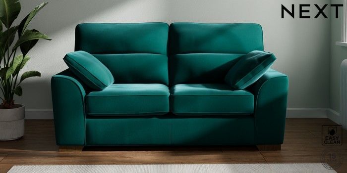 7.2.10 Buy Stamford Highback 2 Seater Sofa Plush Velvet Easy Clean Juniper Green Large Square Angle - Mid from the Next UK online shop Click here to use our accessible website