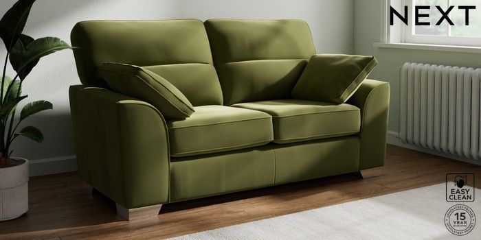 7.3.1 Buy Stamford Highback 2 Seater Sofa Plush Velvet Easy Clean Mid Olive Green Large Square Angle - Chrome Metal from the Next UK online shop Click here to use our accessible website
