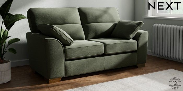 7.2.10 Buy Stamford Highback 2 Seater Sofa Relaxed Linen Look Dark Green Large Square Angle - Brushed Brass from the Next UK online shop Click here to use our accessible website