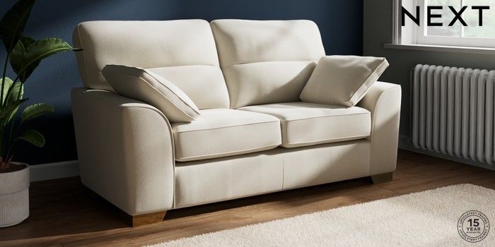 7.2.10 Buy Stamford Highback 2 Seater Sofa Relaxed Linen Look Oyster Large Square Angle - Brushed Brass from the Next UK online shop Click here to use our accessible website