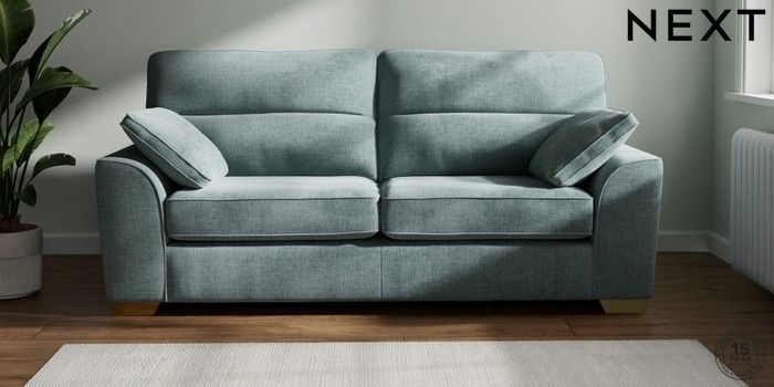 7.2.6 Buy Stamford Highback 3 Seater Sofa Chunky Chenille Light Teal Green Large Square Angle - Brushed Brass from the Next UK online shop Click here to use our accessible website
