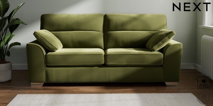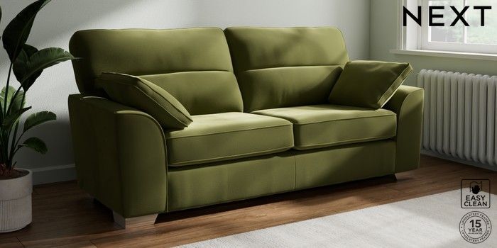 7.3.1 Buy Stamford Highback 3 Seater Sofa Plush Velvet Easy Clean Mid Olive Green Large Square Angle - Chrome Metal from the Next UK online shop Click here to use our accessible website