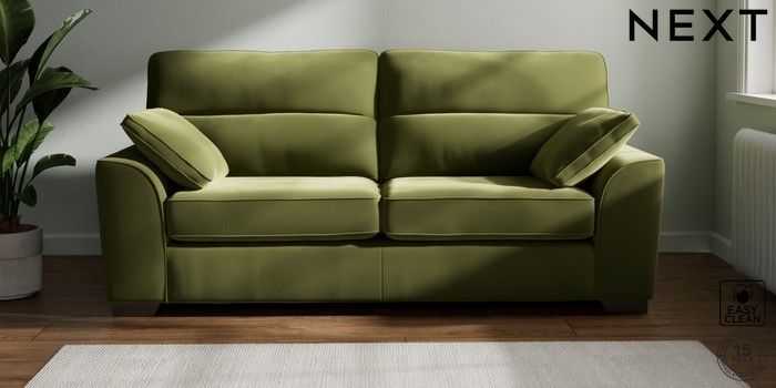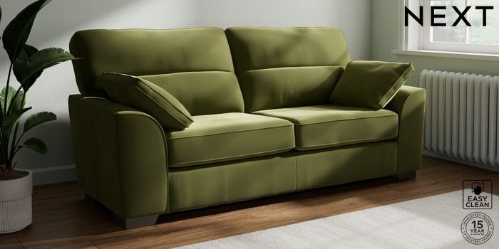 7.3.1 Buy Stamford Highback 3 Seater Sofa Plush Velvet Easy Clean Mid Olive Green Large Square Angle - Gunmetal from the Next UK online shop Click here to use our accessible website