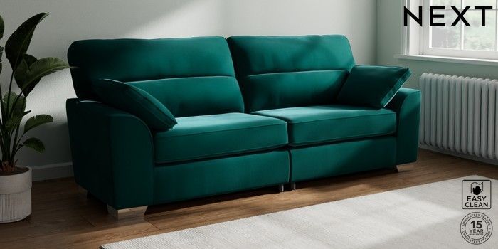 7.3.1 Buy Stamford Highback 4 Seater Sofa Plush Velvet Easy Clean Juniper Green Large Square Angle - Chrome Metal from the Next UK online shop Click here to use our accessible website