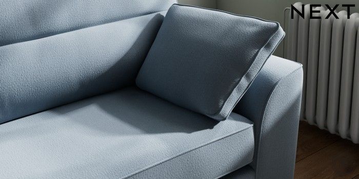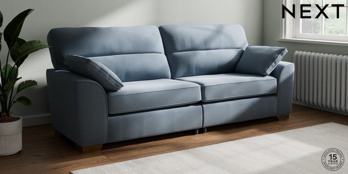 7.2.10 Buy Stamford Highback 4 Seater Sofa Relaxed Linen Look Mid Blue Large Square Angle - Brushed Brass from the Next UK online shop Click here to use our accessible website