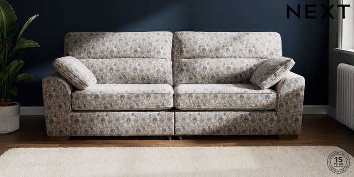 7.3.1 Buy Stamford Highback 4 Seater Sofa Relaxed Linen Look Print Woodblock Floral Blue Large Square Angle - Mid from the Next UK online shop Click here to use our accessible website
