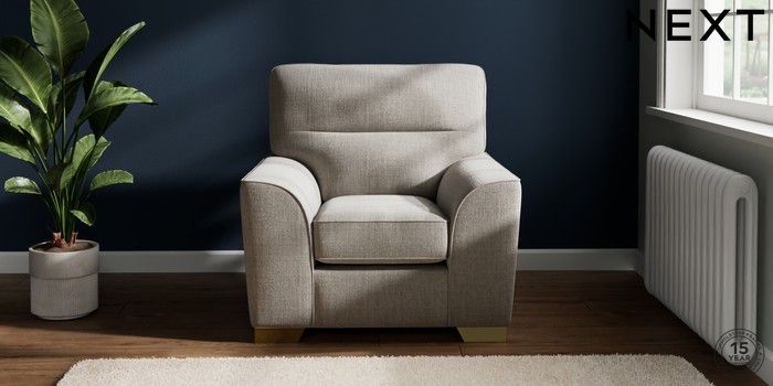 7.2.10 Buy Stamford Highback Armchair Chunky Weave Dove Grey Square Angle - Brushed Brass from the Next UK online shop Click here to use our accessible website