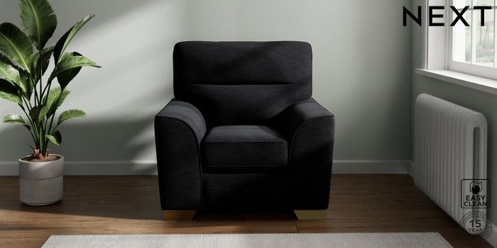 7.2.10 Buy Stamford Highback Armchair Fine Chenille Easy Clean Black Square Angle - Brushed Brass from the Next UK online shop Click here to use our accessible website