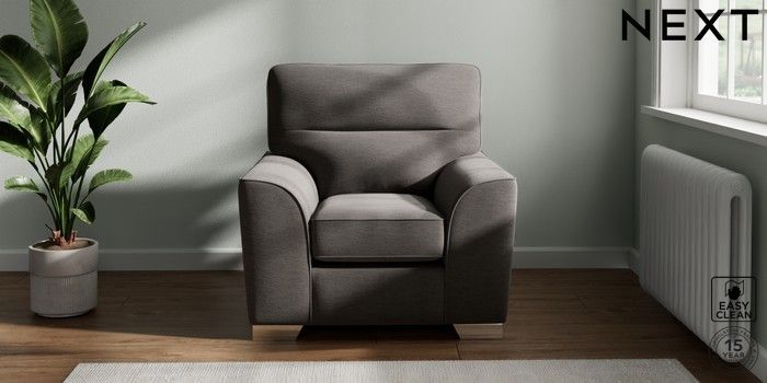 7.3.1 Buy Stamford Highback Armchair Fine Chenille Easy Clean Dark Smoke Grey Square Angle - Chrome Metal from the Next UK online shop Click here to use our accessible website