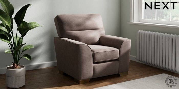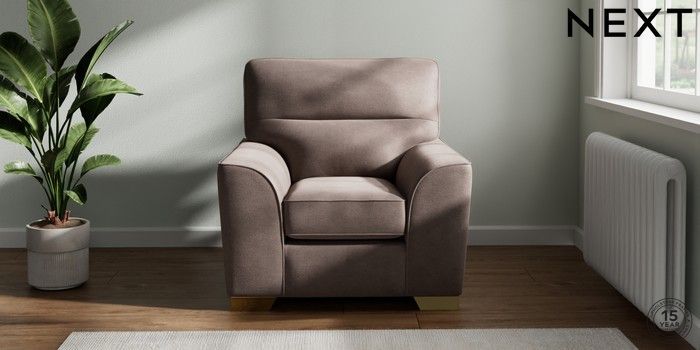 7.2.10 Buy Stamford Highback Armchair Luxe Chenille Mink Brown Square Angle - Brushed Brass from the Next UK online shop Click here to use our accessible website