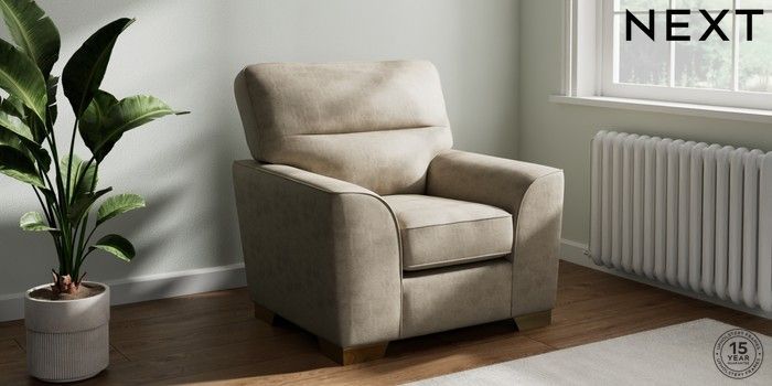 7.3.1 Buy Stamford Highback Armchair Monza Faux Leather Easy Clean Mink Brown Square Angle - Brushed Brass from the Next UK online shop Click here to use our accessible website
